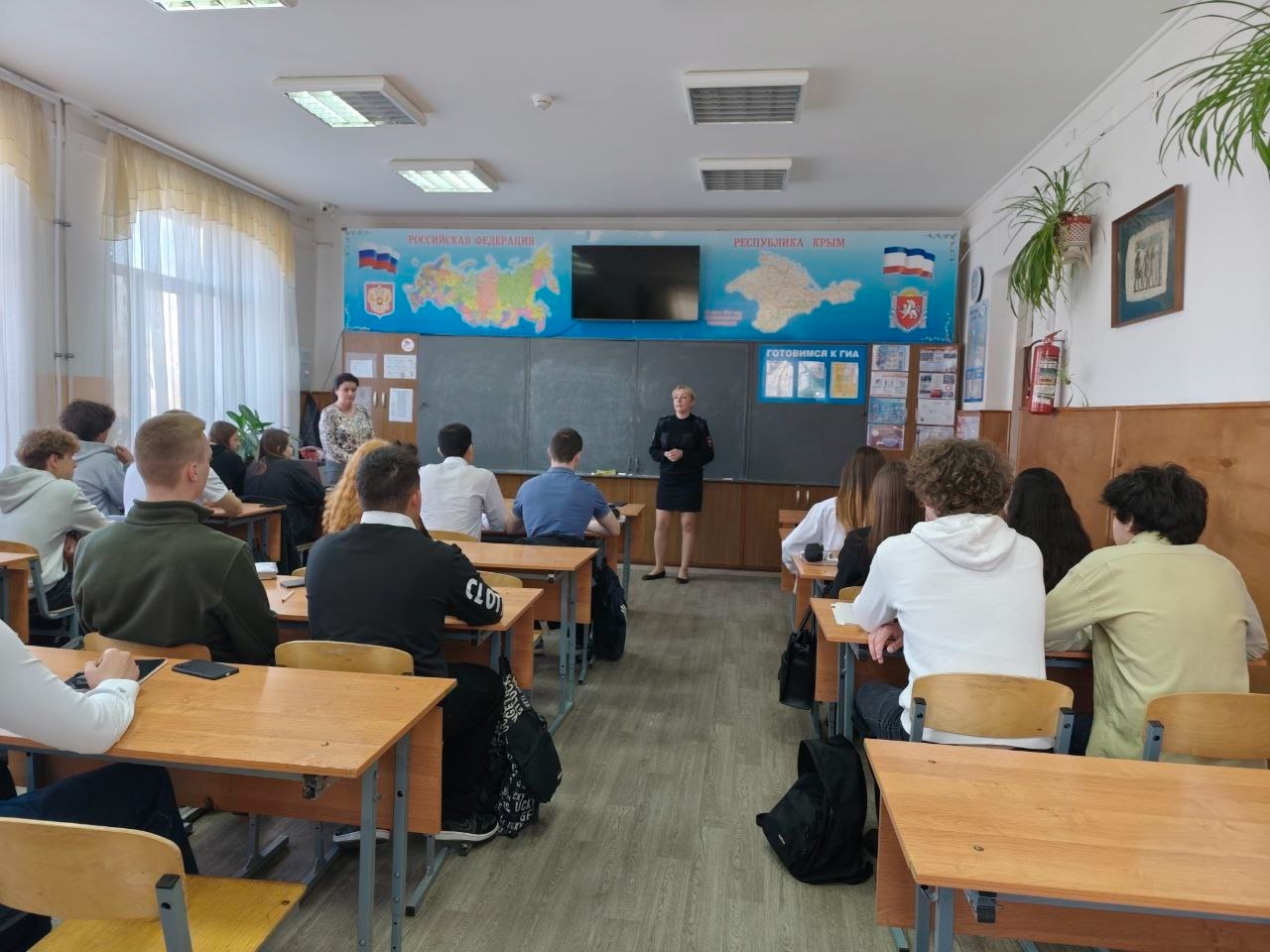 Старший инспектор ОПДН ОП № 3 "Центральный" майор полиции Н. В. Ковалевская провела беседу с обучающими 9б, 10 и 11 классов.