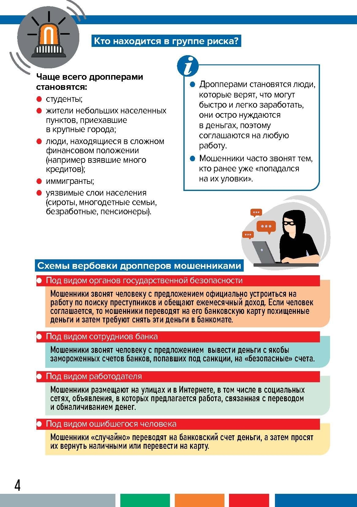 Дроппер - человек, который обналичивает деньги, украденные мошенниками с банковских счетов третьих лиц. Дроппер не является инициатором преступления, а выполняет указания злоумышленников, получая за это деньги.
